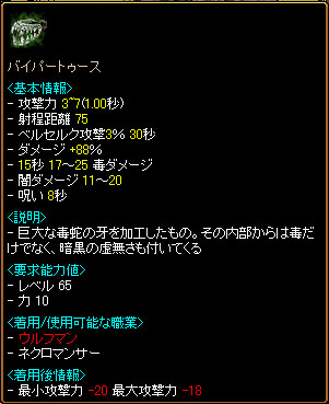お気楽に生きる物理アチャ。ソロが基本なのは兄と同じ。 高火力、重装甲を目指しているが、現時点では火力重視で育っている。 兄からいろんなものを貰って育っているために、あまり、苦労した経験が無い。 好きな飲み物は青ポとRedBull。嫌いな飲み物はお酒。